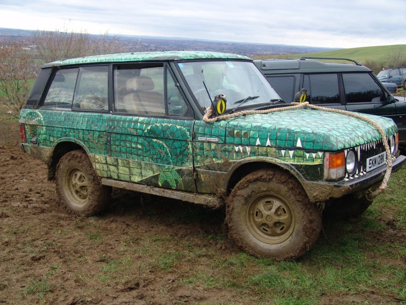 ... or rebuild it to concours condition (not cheap and would take a lot of time and effort). If I was to rebuild my Range Rover to as good as new (or better), I could get some ideas, tips and techniques from the team restoring the first Range Rover off the production line. I could custom paint my two door Range Rover as a reptile such as a crocodile. The paint scheme below was inspired by a book owned by the driver's daughter and was applied by the driver. Very impressive including the spot lights as eyes. I would however have to ensure I didn't damage any body panels requiring them to be replaced. A 'standard', unmodified two door Range Rover can perform well off road. Home Tomcats Other Options Off Road Racers |