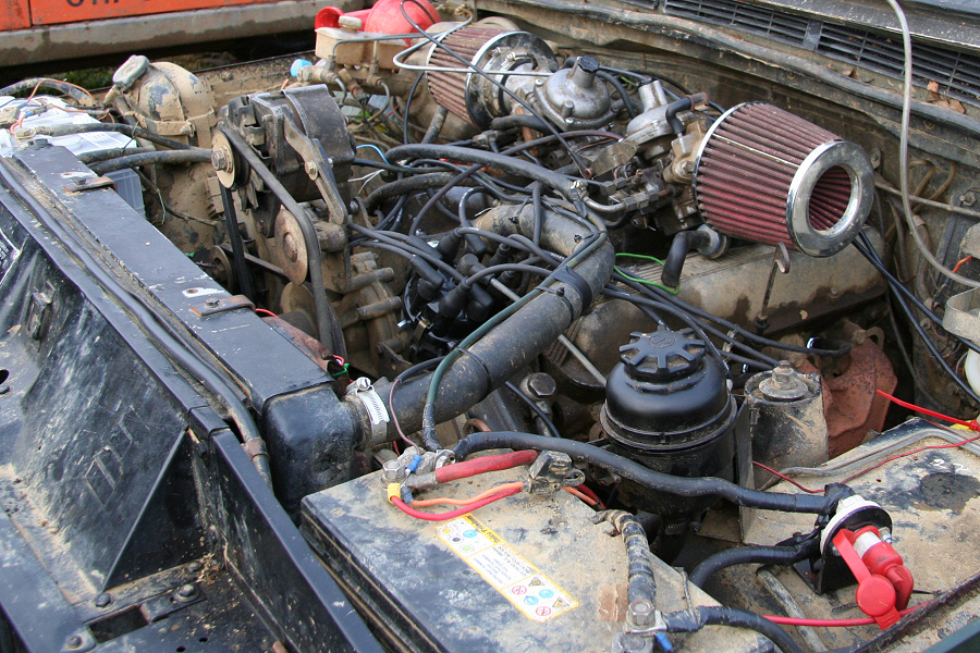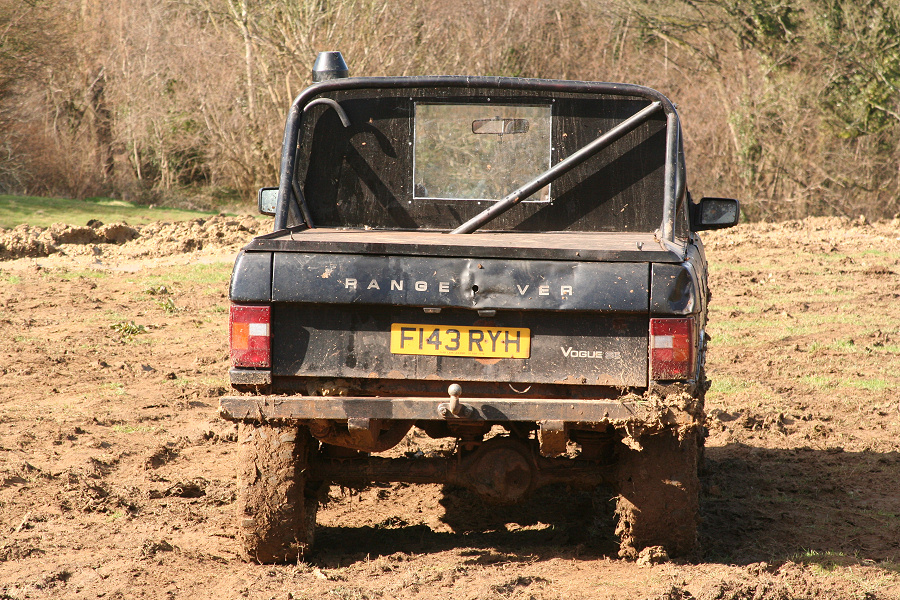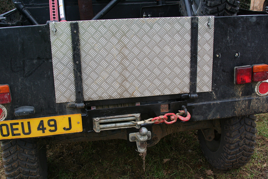 Here is yet another Range Rover that now only has 2 doors, but started with 4, before it was shorted to improve the rear overhang and a cab fabricated to leave the bobtail pickup it is today. The original (lower) tailgate has been discarded and replaced with a chequerplate item (that will not rust so easily). This off-roader is equipped with a winch at both ends. The rear winch is mounted below the new floor.