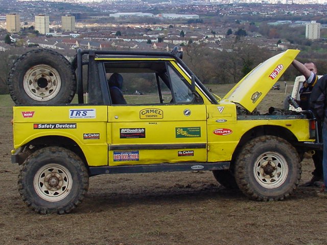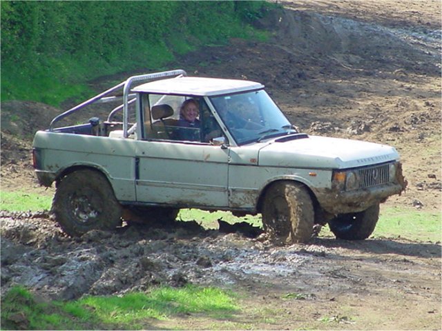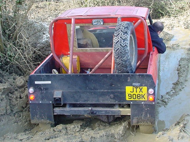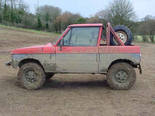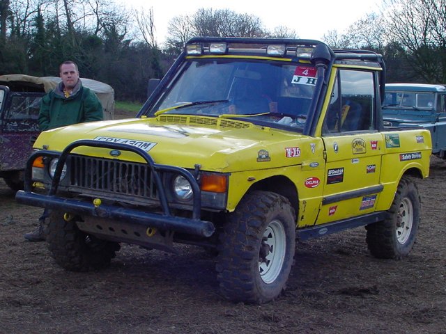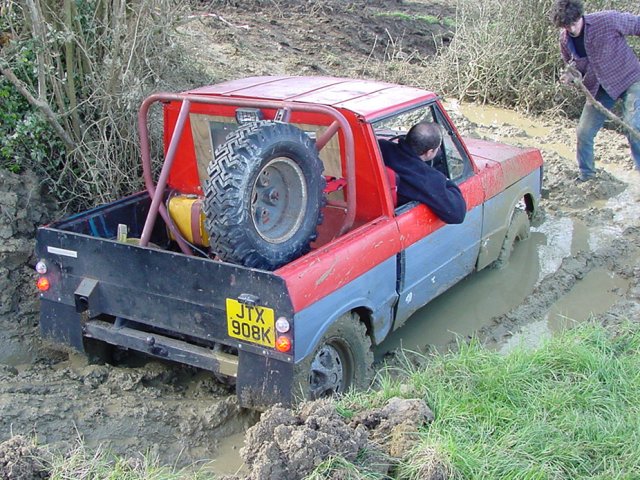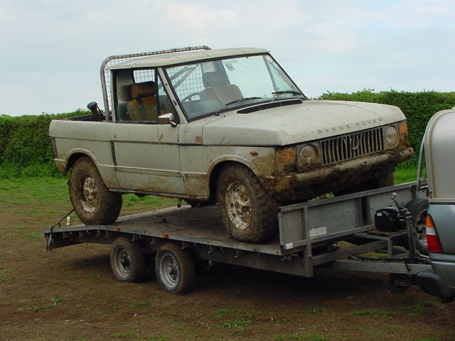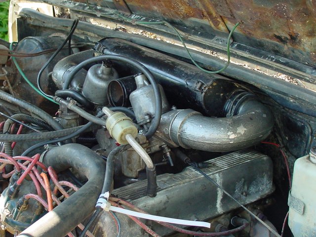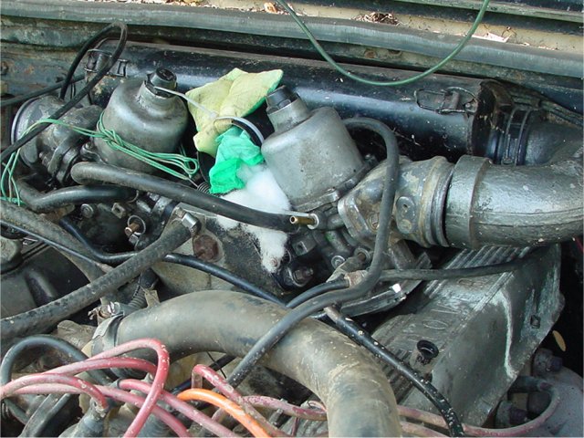 The first bobtail Range Rover pick up below had only been bought by its new owner a few days before he took it out for the first time. It arrived (and left) on a trailer, which was a good thing as it had some reliability problems. Look at the photograph to the right (click on it for a bigger picture) and see if you can see why the Rover V8 engine was not performing very well. This was fixed so the owner could have fun in the mud. |