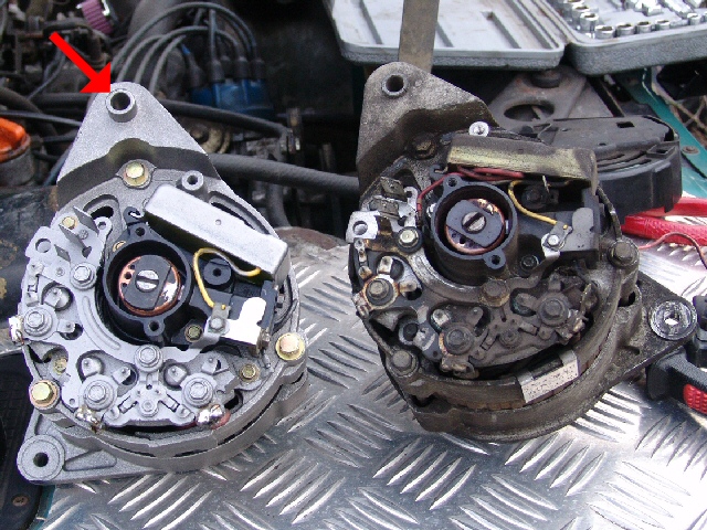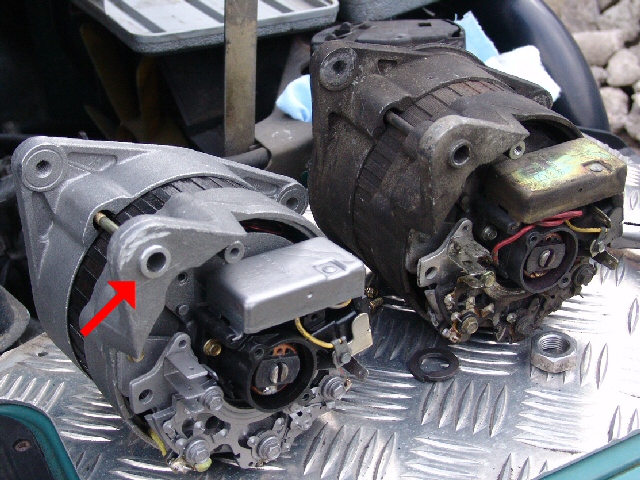Then came the size problem. There was a boss / spacer that was longer on the new alternator. It is arrowed in picture (before the bracket was moved). I ground it off otherwise the pulley would not have been in line with the other pulleys and the drive belt. |