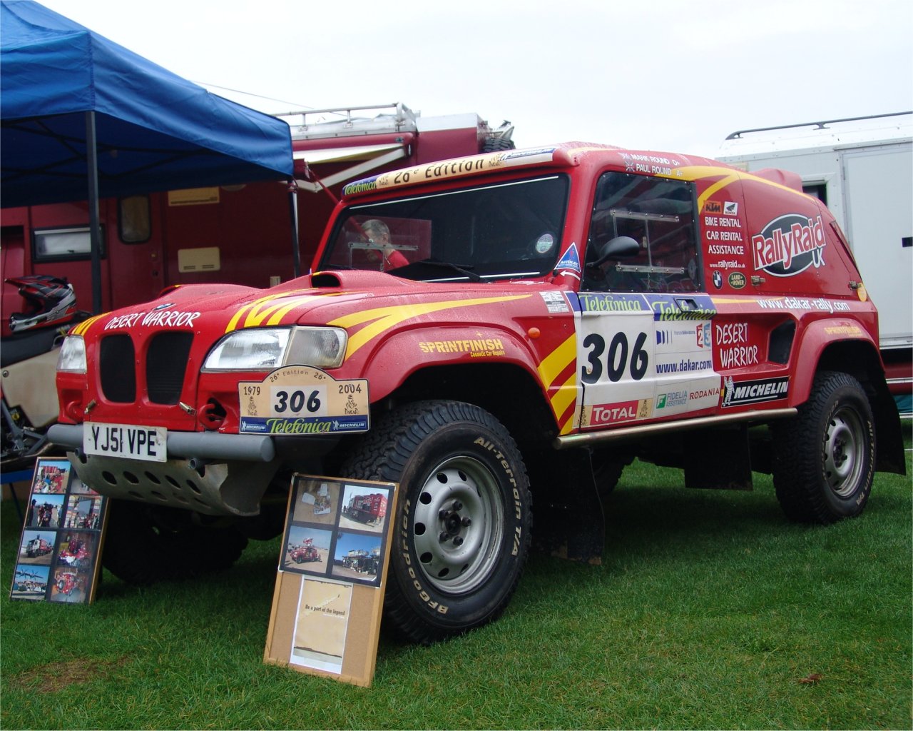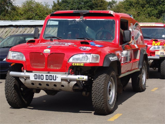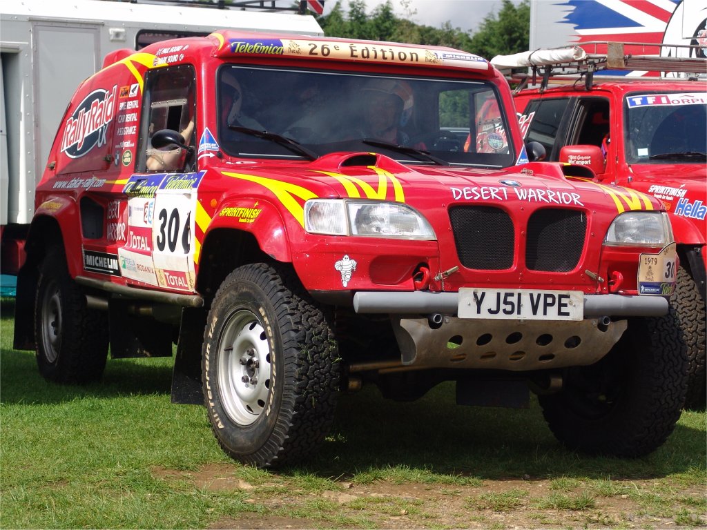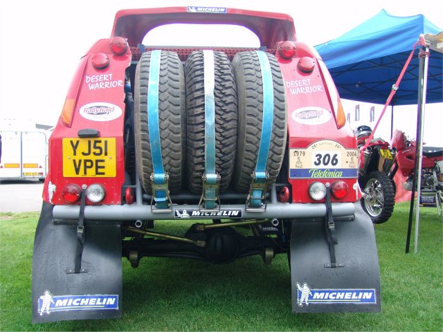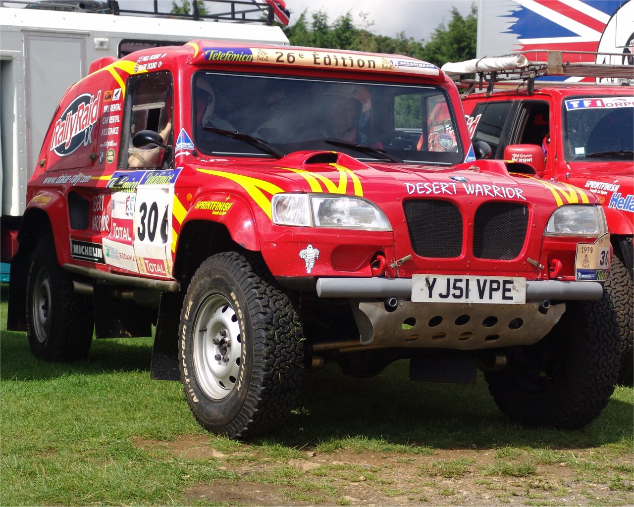 The Desert Warrior is constructed on a purpose built chassis made from 3" tubing, not a donor chassis like the Tomcat. The design of the chassis means that things like the fuel tank can be mounted lower down than in a Bowler Wildcat and the centre of gravity is lower. This makes the Desert Warrior more stable than a Bowler Wildcat. The Desert Warrior also has a longer wheelbase at 106 inches than the Bowler Wildcat or Range Rover/Tomcat at 100 inches. This makes it more stable at speed when racing in the desert, in a straight line, but harder to turn. This makes it less suitable for me as I intend to use my off-roader around a busy city. Desert Warrior WallpaperChoose the most appropriate size of Desert Warrior wallpaper for your screen. Paul is now arranging for all the parts to be made by experts in their fields eg. the body by a GRP expert. He will then be putting together a kit of parts so that other people can build their own Desert Warrior. For more details and photos of Rally Raid UK’s rally raid and Dakar successes, try (http://gallery.rallyraid.co.uk/gallery/index.asp). Home Tomcats Other Options Off Road Racers |