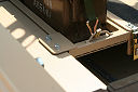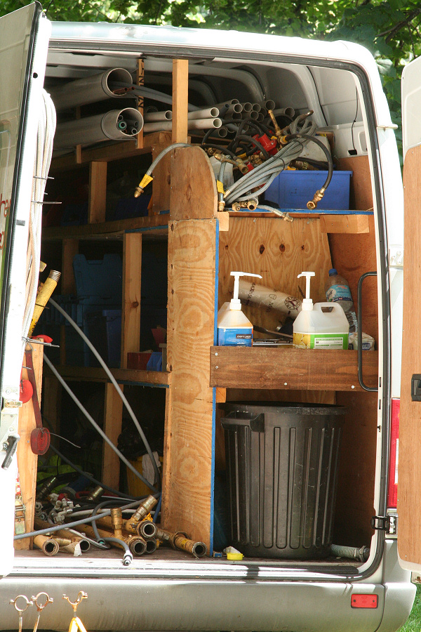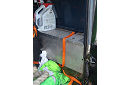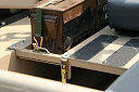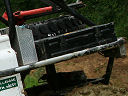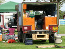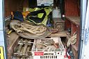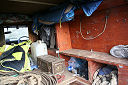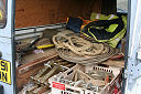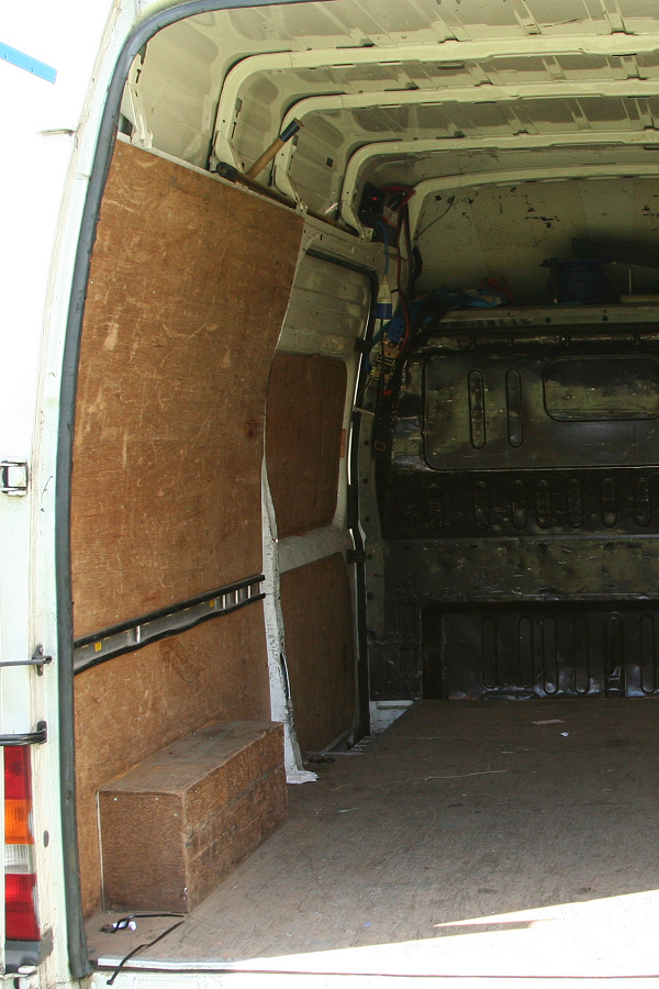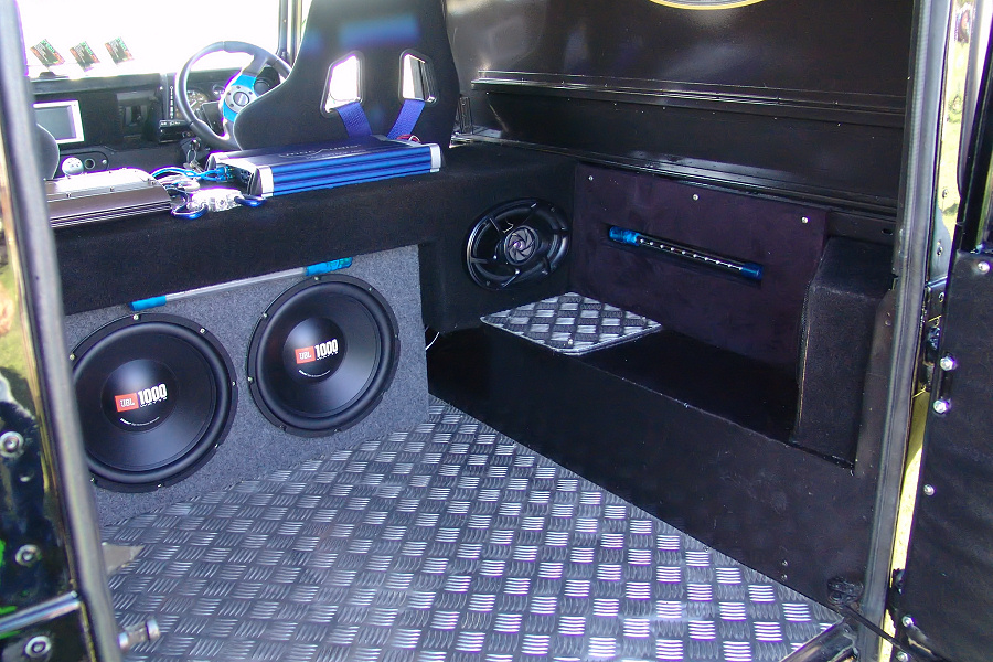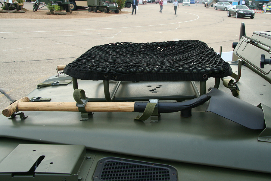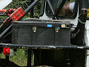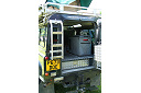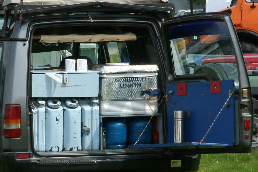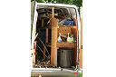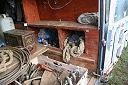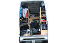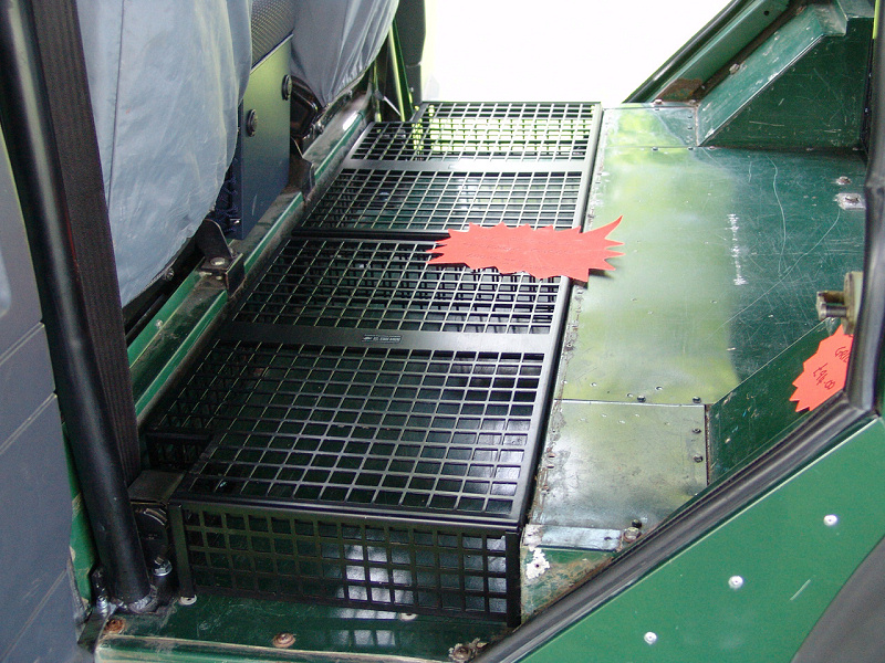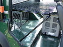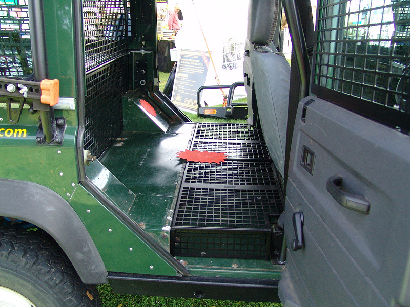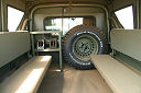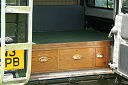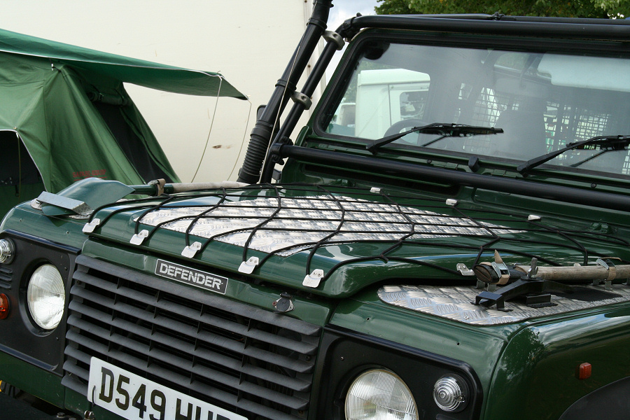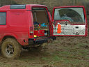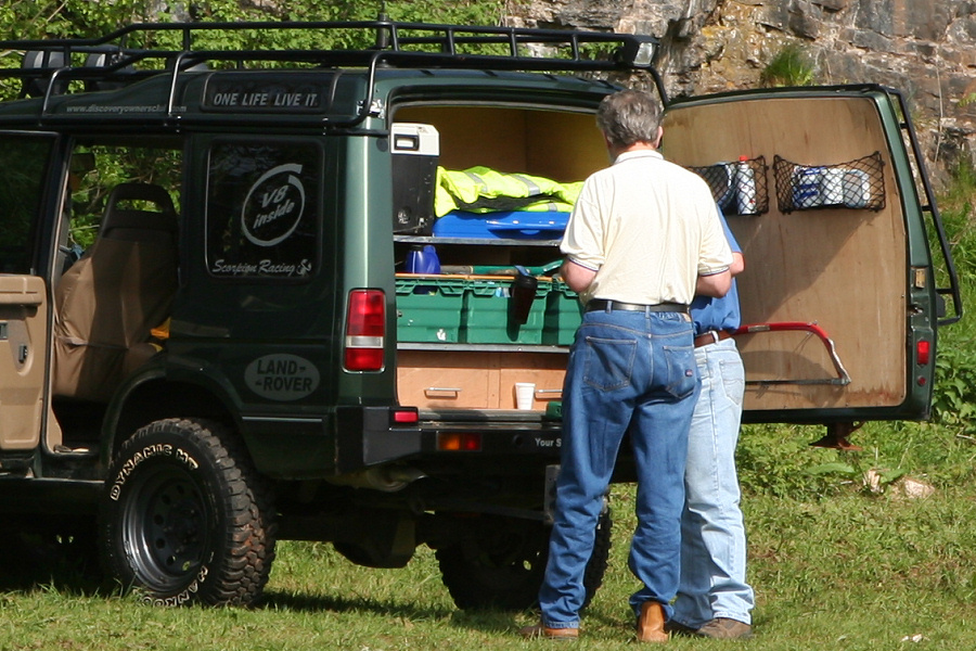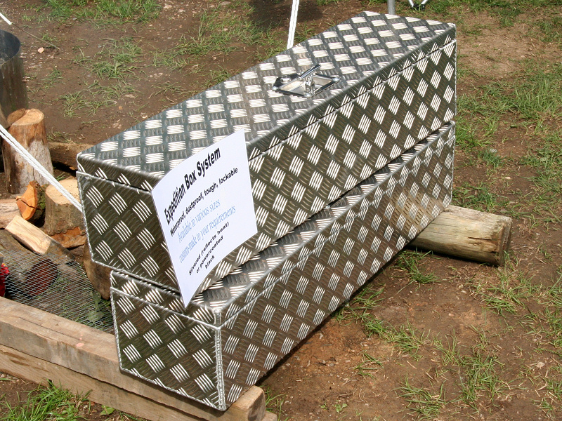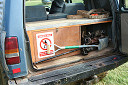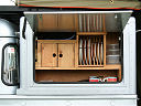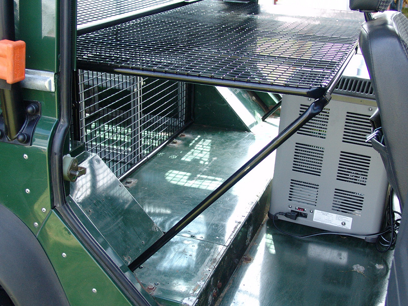 Another, more expensive option, would be plastic boxes or cases (eg. Pelti or Storm). Whatever type of box should be lashed down or prevented from moving some other way. However, I usually transport my stuff in bags, which are easier to carry and stand out less when undertaking other activities with friends. Using boxes, cases etc is also not a very flexible system. If I want to carry a large object, I would have to remove all the boxes and store them somewhere. It would be a simple option to find and buy some strong boxes of the right size and place a board on top of them as a sleeping platform. If I could find strong enough boxes with flat lids, I wouldn't need to use the board. I could make my own boxes from chequer plate to the size I want, or at least pay somebody that can weld aluminium to make them for me. Dedicated Metal CagesA box in the footwell, a removable shelf in the back with bins to either side and a table on the rear door for cooking looks a very good idea. Note the shape of the foot well cage allowing for the seat belt reel. The above stowage solutions were supplied by Overland Expedition Company, but their web site http://www.oec4x4.com/ does not seem to work fully yet (August 2006). I saw the Mantec version first, but have not photographed it. Drawers and Shelf on Rear DoorAnother popular commercial option is a metal drawer supplied by Mobile Storage Solutions. The Mobile Storage System’s drawer is not as long as the load bed. The remaining bit of the load bed is filled with a chest. There are various sizes for the different Land Rovers. They also make a matching side bin. More details, including the cooker shelf also shown below, can be found at their web site http://www.mobilestoragesystems.fsnet.co.uk/. It would be cheeper if I made my own wooden drawers. The shelf on the back door is good for cooking on. I could buy one ready made, or build my own. Plywood LiningIt is normal practise to ‘line’ the back of a van with plywood to protect the bodywork etc. This can incorporate shelves or little cubby holes for stuff, tools, materials etc. It is an option with Land Rovers, but usually the ones equipped with hard tops. Plywood can be resistant to water, strong and easy to work (cut, join etc) at home without the need to weld. It is possible to incorporate a false floor or sleeping platform with this sort of system. Plywood can also be used to build a bulkhead to separate the ‘cab’ and ‘back’ of the truck. I however have the 5 door Country Land Rover, without the bulkhead, so I can push the driver’s seat further back for a more comfortable driving position. This solution also incorporates a sleeping platform, not usually needed by labourers, but useful to Stig, who owned this Land Rover Defender 110. Side binsA set of side bins are boxes that go on top of the wheel boxes at the side of the pick up bed. Stuff can be put in them to stop it rolling around, and keeps the deep bit of the load bed clear. The boxes don’t have to be solid. They could be made from mesh on a metal frame, or just the space left next to a sleeping platform like the ‘dedicated metal cages’ elsewhere on this page. This is a popular solution for the back of vehicles (Defender 90s) used in winch challenges. RoofrackI wanted a roof rack to carry large sheets of wood or chequer plate, but I did not want to store stuff up there. I will probably produce a seperate page on my chosen roof rack solution, but for now, here are some pictures of other roof racks used for storage. A roof rack is also a good place to mount addition lights (another seperate web page int he future!). On the BonnetApart from being an alternative location for mounting the spare wheel, I could carry some stuff on the bonnet. I could use bungy cords, a cargo net or a special tray designed to carry a camouflage net. Not very secure and not very well protected from the elements. Probably just a good spot for your recovery gear that is already attached, or your camouflage net. OtherFurther ReadingI don’t copy other peoples’ (copyright) material, so if you would like to know more, take a look at;